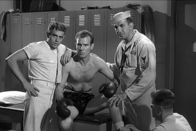 ? Джеймс Дин в фильме «Берегись, моряк!»В ленте киностудии «Парамаунт», вышедшей в 1952 году под названием «Берегись, моряк!», наконец-то Дину досталась роль со словами. В фильме блистал дуэт джазового певца и артиста Дина Мартина и комика Джерри Льюиса. Джеймсу Дину доверили сыграть тренера по боксу в одном эпизоде.