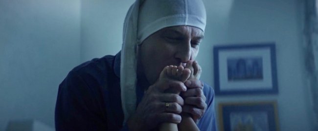 Я сама занимаюсь живописью и очень люблю экранное изображение, глубокие операторские работы. Поэтому сразу понимала, что снимать нашу историю без света и уходить в гиперрелизм, как сейчас многие любят, не нужно. Все-таки мир главного героя довольно эстетский, его фетиш – дорогая обувь и одежда, он живет богато. И в этом плане мы постарались сделать все максимально, несмотря на то, что бюджет дебютного кино довольно ограничен. Если говорить про киноязык, то мне сразу была понятна метафора – как белый кит погружается в воду, на дно, а затем выныривает, так отчасти и наш герой. Поэтому мы понимали, что в цветовой гамме держимся океанической воды. Отсылки к картинам тоже есть – например, в сцене ужина у киргизов это «Тайная вечеря» да Винчи. Там очень тонкий намек на нее, который, возможно, не все поймут. Но мне нравится, когда все не впрямую, не в лоб. Или у нас есть, например, сцена, где Филипп застревает в лифте с грузчиками и пианино, и через клетку держит связь со своей матерью – он и в жизни зависим от нее, будто не обрезал пуповину.