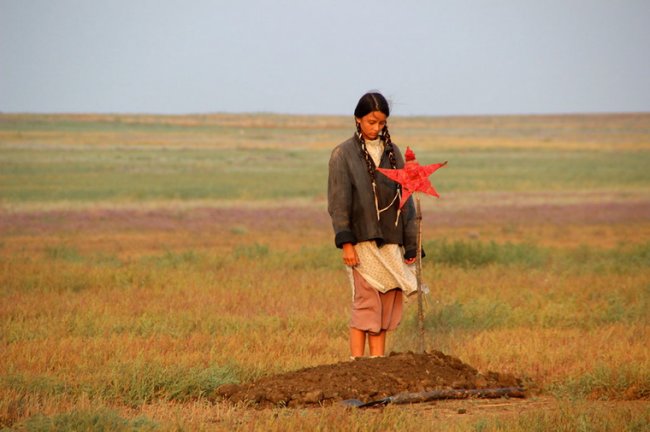 «Испытание» — этакая русско-казахская «Меланхолия»: изможденному отцу не до смеха (хотя в редкие моменты душевного подъема он и демонстрирует оптическую иллюзию «Как я проглотил солнце»), его хозяйственной дочери — тем более. В степи царит размеренный быт, единение с природой, обилие домашних дел и достаток времени на созерцание уходящей в нежно-голубую вечность степи с редкими, искореженными климатом деревьями, и столбами с колючей проволокой, которой человек отгораживает от посторонних глаз новые игрушки.