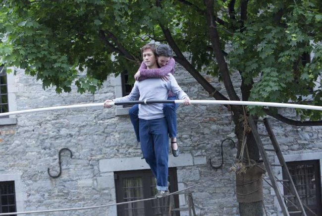 Ключевые сцены «Прогулки» — это кадры с крыши небоскреба, от которых дыхание покидает легкие. Ради них затевался целый фильм, как несколько проходов по канату над головами восхищенных нью-йоркцев стали венцом карьеры Пети. Ради них сам виновник торжества консультировал авторов фильма, а вечно молодой Гордон-Левитт с растрепанной шевелюрой много часов балансировал на фоне зеленого экрана. Ради них зрителя почти два часа бьют по ушам гиперпафосным закадровым текстом, который аутентичен эмоциональным сентенциям самого француза (их можно услышать, например, в документальном фильме «Канатоходец» 2007 года, удостоенном «Оскара»). Ради них биография человека превращается в поверхностную череду удач и выученных уроков, когда Пети — без перерыва на кофе и багет — падает в реку во время банального празднества, а уже в соседней сцене — покоряет Собор Парижской Богоматери.