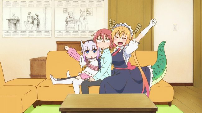 Кобаяси — 25-летняя офисная работница, которая дома только ест и спит, а конец трудовой недели отмечает бокалом-другим пива. Однотипная повседневность тянется и тянется, пока однажды на пороге квартиры Кобаяси не появляется Тору — жизнерадостная девушка в униформе горничной. Она говорит, что ее пригласили здесь пожить. Зачин параноидального триллера — на самом деле отправная точка комедийного квартирного фэнтези о совместном быте людей и драконов, которые способны принимать человеческий облик (часто — неприлично милых девушек). Вслед за Тору появляются и другие жители мира исполинских летающих ящериц, которых блага общества потребления заставляют отказаться от людоедских (точнее человеконенавистнических) взглядов. Вообще «Кобаяси и ее горничная-дракон» относится к жанру повседневность, в котором «ничего не происходит», а сюжет складывается из бытовых зарисовок, где есть место магии, видеоиграм, еде и, конечно, любви. (А.Ф.)