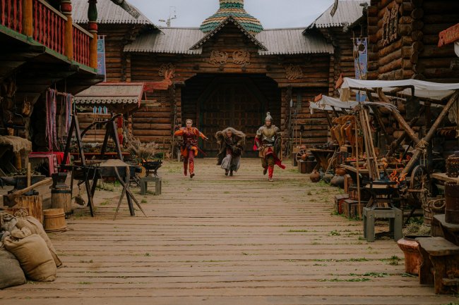 Огромную декорацию Белогорья – с его торговой улочкой и практически пряничными домиками – еще перед первым фильмом возвели в Химках, в долине реки Сходни. Площадь в 6 тысяч квадратных метров была вдохновлена эстетикой русского Средневековья XI века и иллюстрациями Ивана Билибина и Аполлинария Васнецова. За шесть лет, прошедших с «Последнего богатыря», декорация, конечно, с учетом съемок и «Корня зла», и «Посланника тьмы» не простаивала, но перед возвращением уже в сериальное Белогорье фасад многих построек пришлось обновить. А еще «посадить» волшебную яблоню, которая сыграет важную роль в сюжете, и построить терем Ивана, который теперь является центральным зданием Белогорья. Сам Иван, впрочем, не особо и изменился.