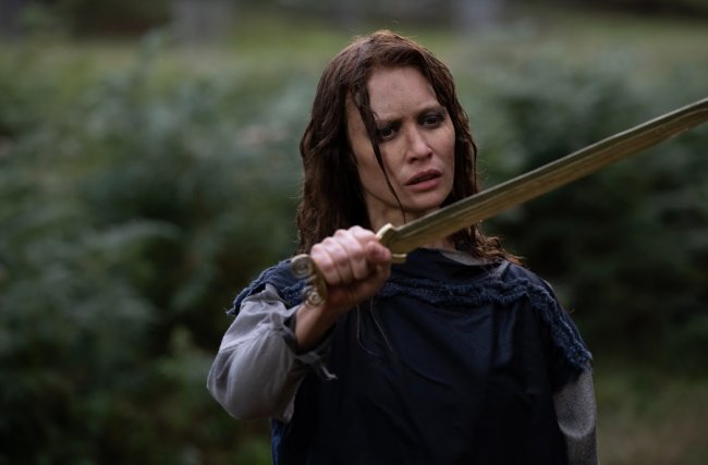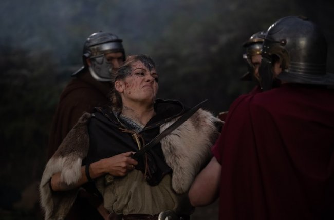 Но на деле «Будика» не является историческим фильмом — и даже не особо им притворяется. Ленту довольно быстро сдает дар, полученный героиней от супруга, бронзовый меч, демонстрирующий магические свойства. Лезвие оказывается прочнее и острее стальных клинков, перемещается в пространстве, подчиняясь воле Будики, и издает таинственный гул, когда оказывается у нее в руках. Это оружие дает понять, что данная картина о существовавшей в действительности героине задумывалась как фэнтезийная история — то есть как сказка, пускай и жестокая, кровожадна, полная сцен пугающе убедительного насилия. Эмоциональным стержнем этой сказки является сыгравшая Будику Ольга Куриленко; история взаимоотношений ее героини с дочерьми — необходимый драматический элемент, без которого фильм, наверно, развалился бы на отдельные экшн-сцены (пускай и довольно неплохо снятые). Куриленко вряд ли впечатлит аудиторию выдающейся актерской игрой, зато ее трансформации наверняка останутся в памяти надолго. Из жены и матери, неумело орудующей деревянным мечом во время игры с детьми, она превращается в грозную воительницу, безжалостно крошащую римлян. Ближе к финалу есть эпизод, где Будика в готическом макияже пьет что-то из черепа поверженного врага; такой вы Куриленко точно еще не видели. Понятно, что этот эпизод — трюк, но он работает, образ вышел ярким, запоминающимся.