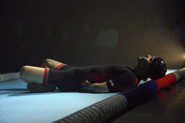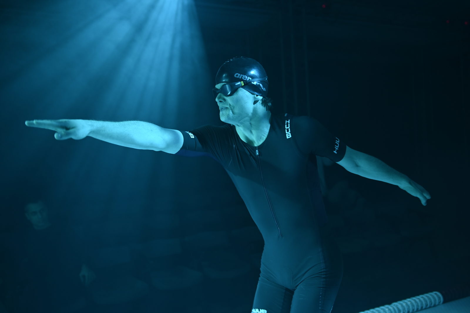 Сначала не было ничего, кроме текста. Текст как рефлекс состояния Паши. Потом я понял, что герою нужны банальные цели, задачи, двигающие его по курсору истории. Возникла история псевдо-спортсмена, дуальной реальности и мечты. Возникло место - дорожка бассейна как линия движения. Сценография, геометрия рассадки зрителей, и в общем-то полноценный спектакль. Видимо, стихия воды, из которой и вышел человек, и подсказала мне подобное место действия. Жизнь как дорожка, по которой мы плывем в каждом личном бассейне от точки А к точке Б. Специально мы не придерживались минимализма в сценографии. Это случилось естественно. Ведь моноспектакль — животное мобильное, которое можно привезти в чемодане. На фестиваль или в другой город, как сейчас.