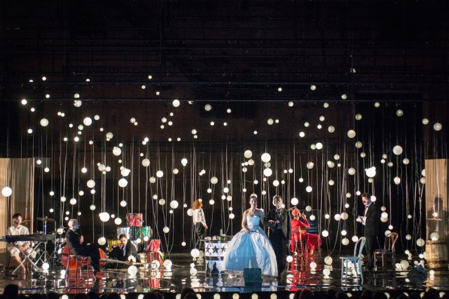 Бутусов исправляет «помарку» Брехта: его версия «Барабанов» ближе к «эпическому театру» и постоянно напоминает зрителю, что перед ним спектакль. Первую сцену семейство Балике разыгрывает совсем механически, словно запущенные ключом куклы. Затем с потолка начинают опускаться горящие вывески, вроде «Жрут» или «Пиккадилли», диалоги прерываются танцами с боем в барабан под Skip to the bip немецкого ню-джаз-коллектива Club des Belugas. Официант Манке (Анастасия Лебедева