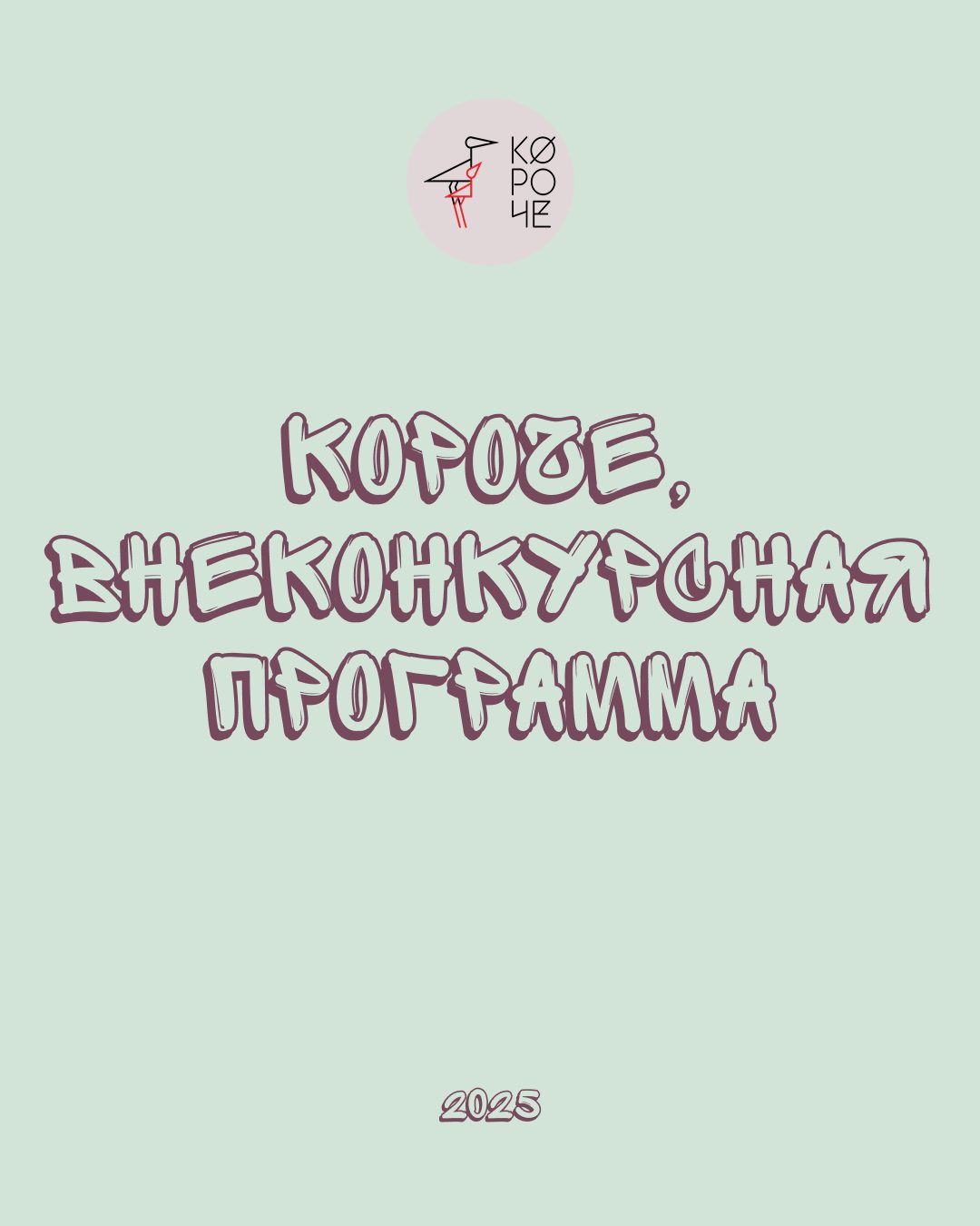 В рамках внеконкурса будут представлены традиционные авторские подборки отборщиков короткого метра Надежды Королевой и Вадима Рутковского, а 23 августа будет показана семейная программа «Короче. Детям» - в кинотеатрах «Синема парк» и «Киноленд». В программу вошли короткометражные анимационные и не только ленты для семейной аудитории.