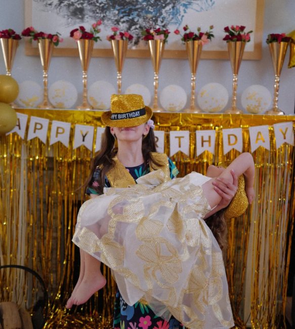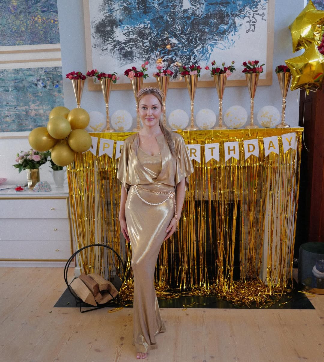 устроила для близких домашнюю вечеринку, дополнив интерьер золотистым декором. Дресс-код был соответствующий: именинница и гости появились на празднике в нарядах золотого цвета.
