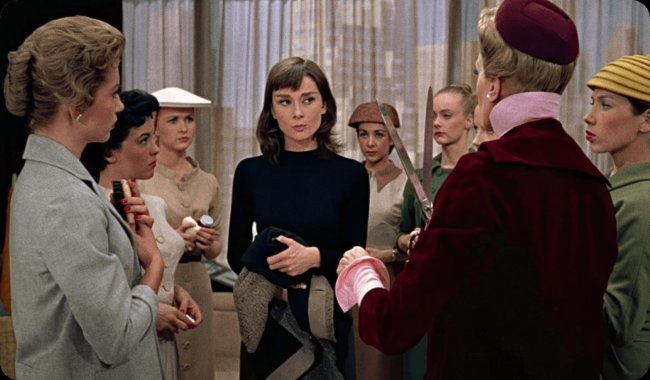 Музыка Гершвина, танцы, внутрянка организации фотосессий, красивые наряды и неизбежная романтика прилагаются. Костюмы для фильма создавал сам Юбер де Живанши, так что неудивительно, что образы Хэпберн сразу стали культовыми: Чёрная водолазка с чёрными брюками-дудочками и балетками, алое платье с белыми перчатками и, конечно, маленькое чёрное платье Givenchy с подолом в пол.