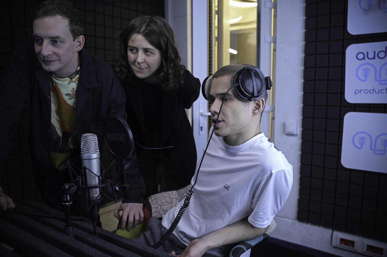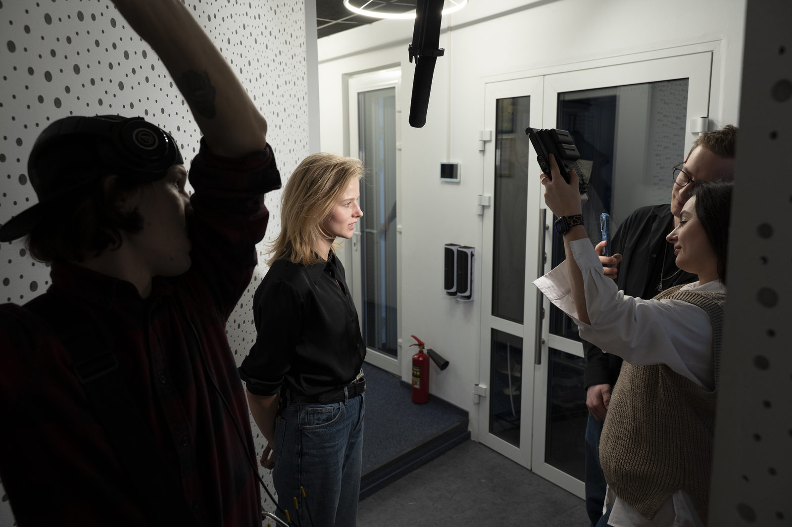 Когда я пришла в проект, уже было заявлено желание продюсеров, озвучивать героев, но было непонятно, как это органично вплести в ткань сериала. Хотелось сделать историю «горизонтальной», где все на равных. Когда я придумала этот прием передачи голосов и «сонастройки» в кадре, для меня все собралось воедино. Представляете, если бы мы не видели этой сцены, возникла бы совсем другая интонация у проекта и много вопросов, например, кто решил, что голос конкретного человека должен быть именно таким. Поэтому я подумала, что они будут выбирать интонацию с артистами вместе. Участники впервые встретились с актерами во время съемок, важно было запечатлеть сцены их знакомства.