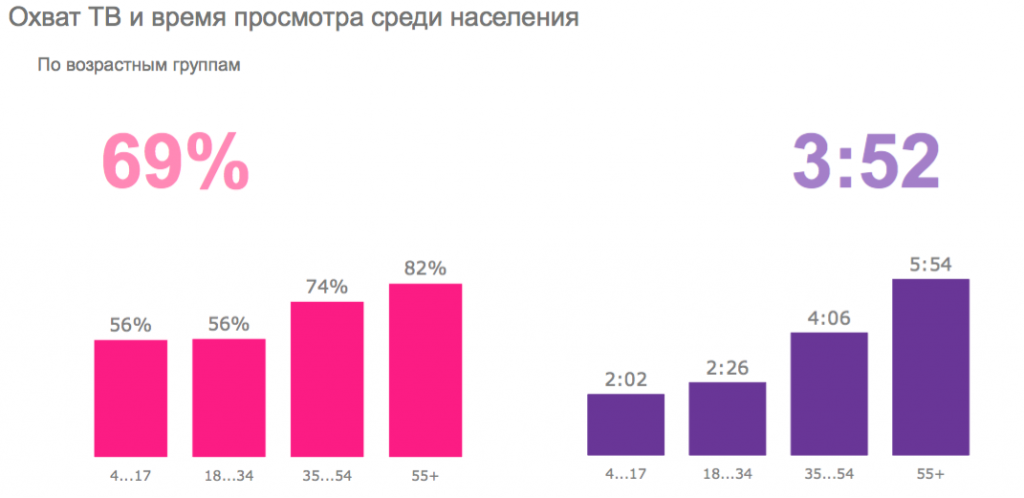 По городам различается не только среднесуточный охват, но и время просмотра. В среднем все зрители России от 4 лет смотрят ТВ 4 часа в день, однако показатель меняется в зависимости от возрастной категории. Например, зрители от 4 до 17 лет тратят меньше времени на просмотр (2 часа). Чем старше группа, тем больше времени приходится на просмотр (до 6 часов). Скорее всего, это логичное свидетельство того, что молодые зрители больше смотрят контент на других устройствах.