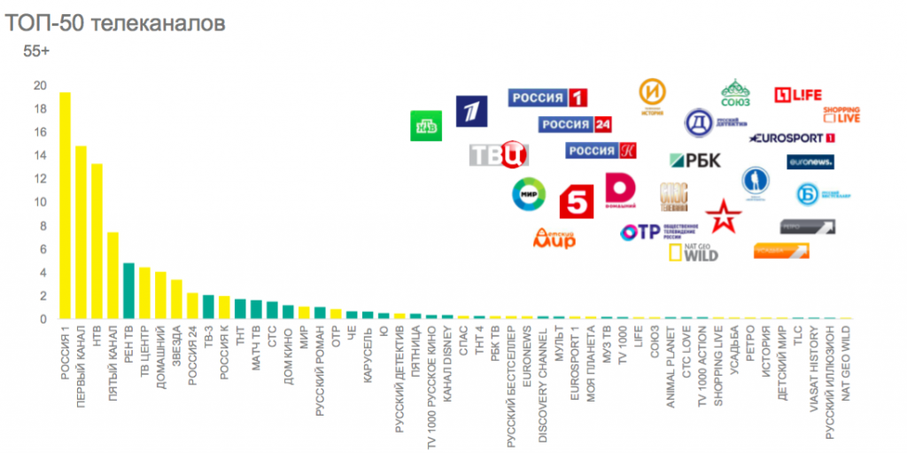 Аудитория телеканалов СТС и НТВ заметно младше, а телеканала РЕН — более мужская. Совокупная доля ТОП-10 телеканалов составляет порядка 65%. Топ-50 каналов — 90% зрителей.