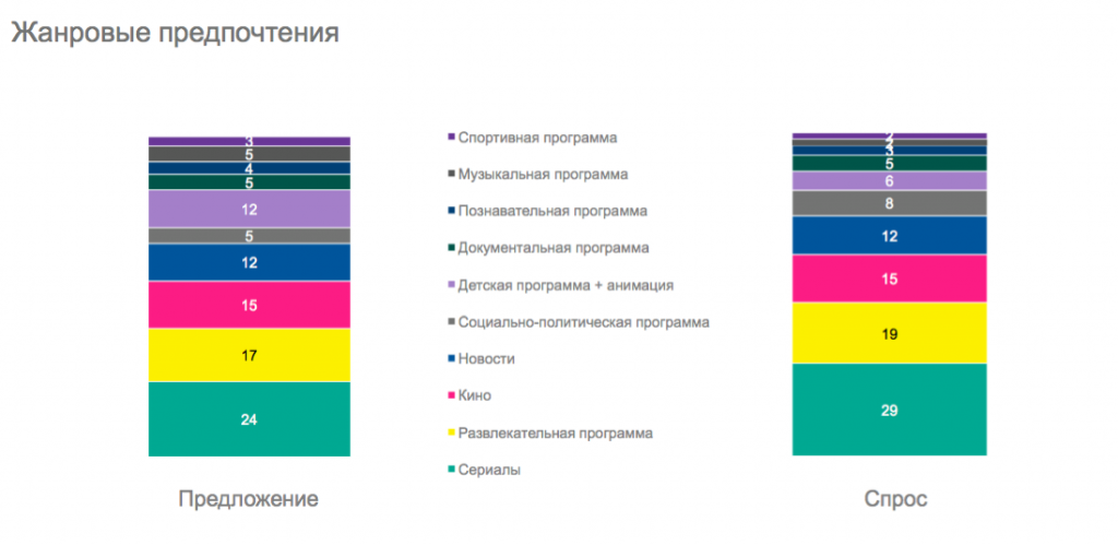 Mediascope проанализировал данные телесмотрения национальных каналов по жанровым предпочтениям. Здесь заметна интересная тенденция, что наибольший спрос у зрителей наблюдается к сериалам: в среднем по рынку в эфире ТВ 24% занимают сериалы, при этом предложение ниже спроса. Совокупный спрос сериалов и развлекательных программ составляет более 50%.