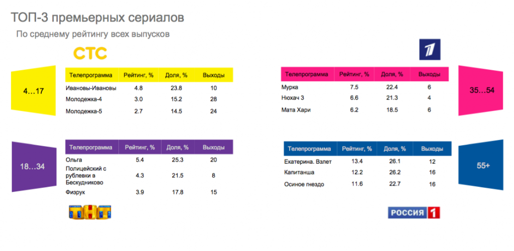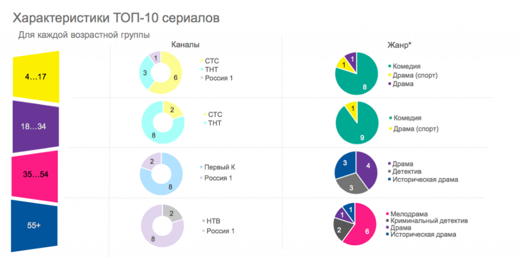 Самая многочисленная группа - возрастная аудитория. Компания проанализировала самые популярные сериалы внутри каждой группы. Интересно, что внутри категорий Топ-3 сериалов принадлежит одному каналу.