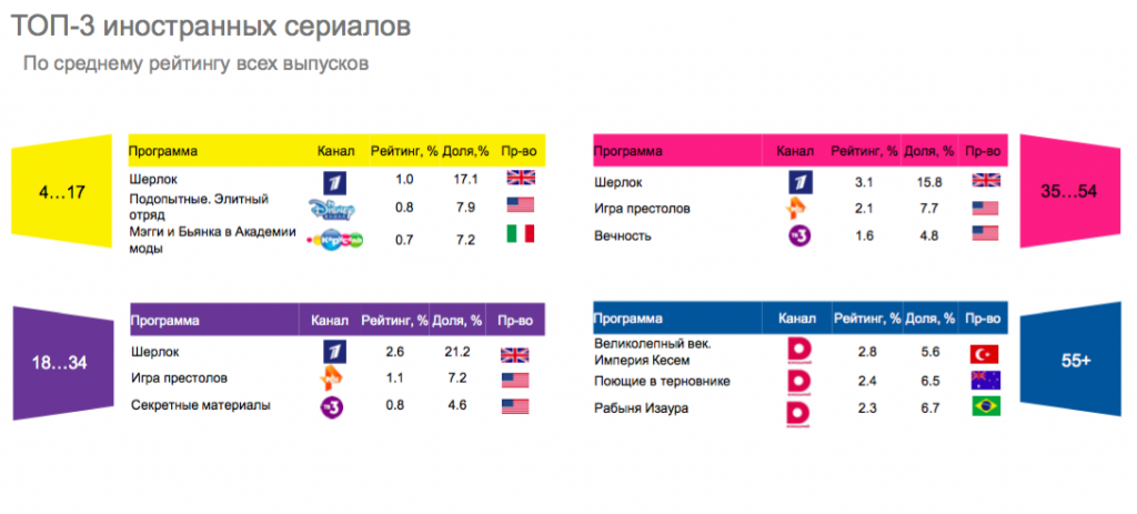 В Топ-3 ни для одной возрастной группы не попал иностранный сериал — рейтинги отечественных, как правило, выше. Отдельно проанализировав зарубежный контент, компания обнаружила, что для трех возрастных групп верхнюю строчку занимает сериал «Шерлок». Если для групп 18-34 года и 35-54 года первые два сериала совпадают, то на третьей позиции оказываются разные сериалы, выходящие на телеканале ТВ-3. В старшей группе традиционно остаются популярными турецкие, латинские и индийские сериалы.