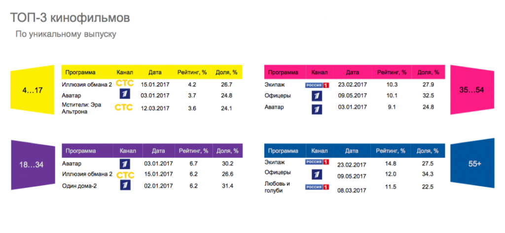 По возрастным группам ситуация иная: если в группе 4-17 лет и 18-34 лет, все фильмы иностранные, то в более старших преобладают российские. Ленту «Аватар» Первый канал традиционно показывает в начале января, ежегодно собирая большое количество зрителей разных возрастов у экранов.