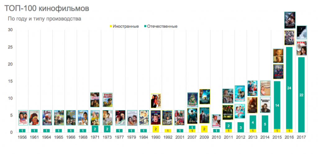 В Топ-100 кинофильмов по всем возрастам попало множество советских картин, среди которых самый ранний — «Весна на Заречной улице» 1956 года. При этом в рейтинг попало только 10 лент иностранного производства.