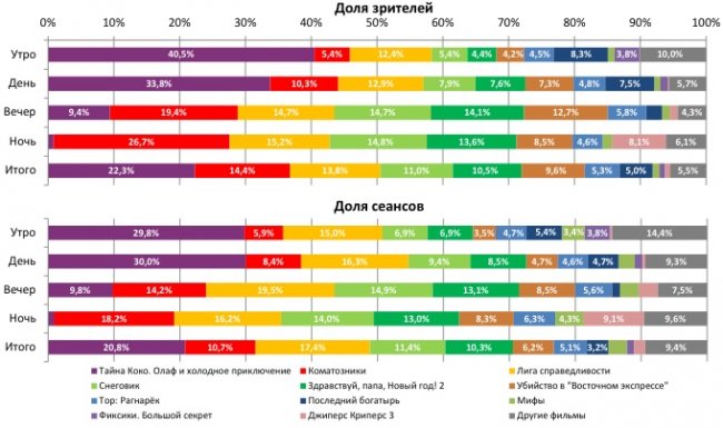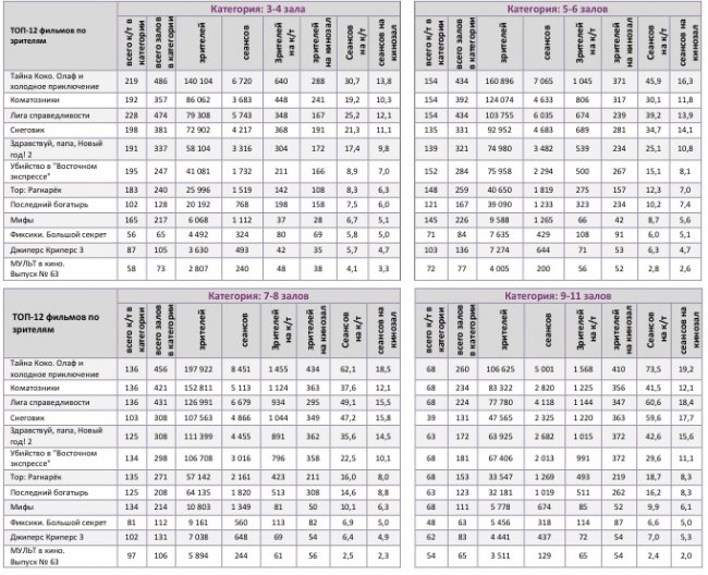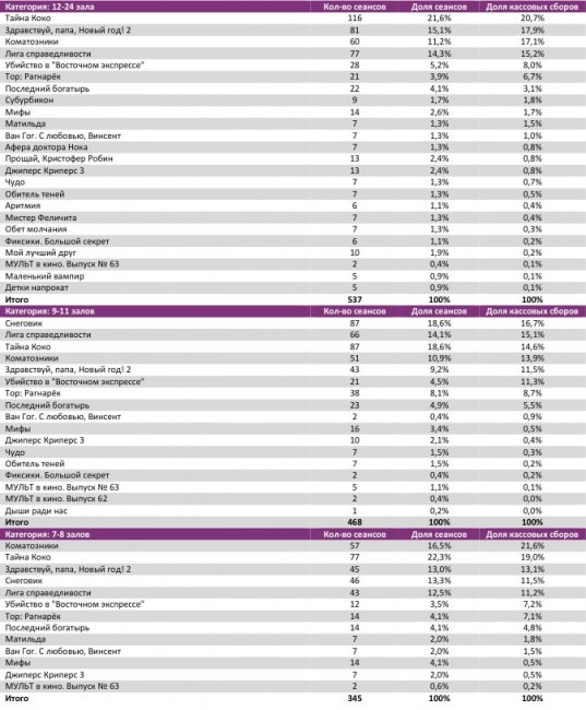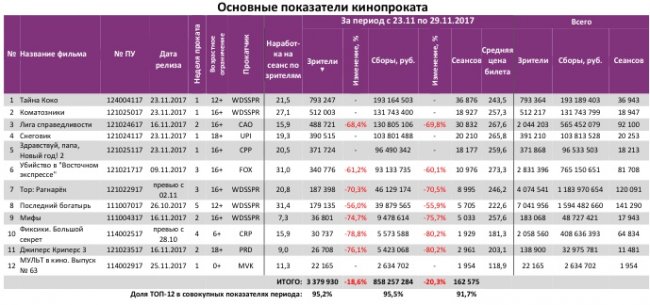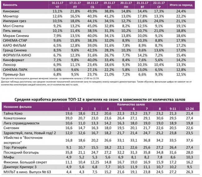В семи лучших кинотеатрах страны лидерами стали разные фильмы – «Тайна Коко» (3 кинотеатра), «Коматозники» (2) и «Снеговик» (2).