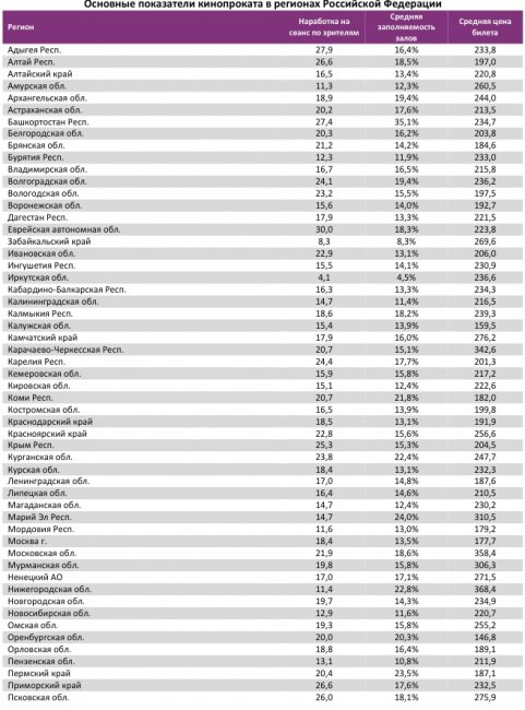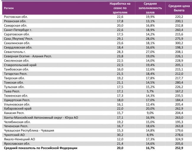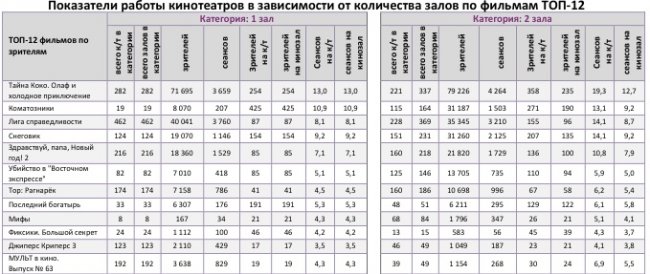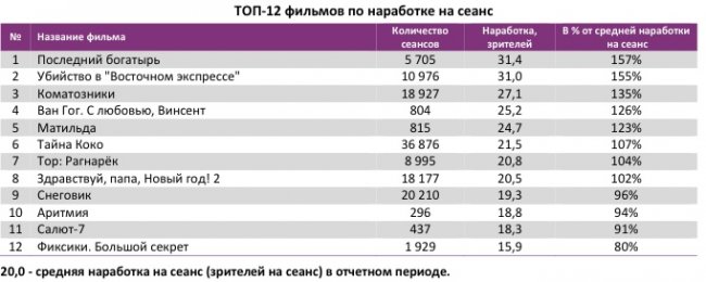 «Последний богатырь» стал лидером и по наработке на сеанс. Также в топ-12 по этому показателю еще четыре российских проекта – «Матильда», «Аритмия», «Салют-7» и «Фиксики».