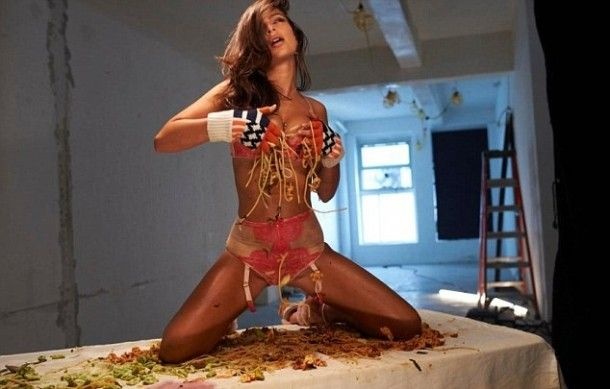 Недавно 26-летняя Эмили приняла участие в съемке рождественского календаря от Love Magazine. На фото модель позирует в розовом кружевном белье на столе с едой (буквально под ногами у нее лежат спагетти в томатном соусе и митболы).