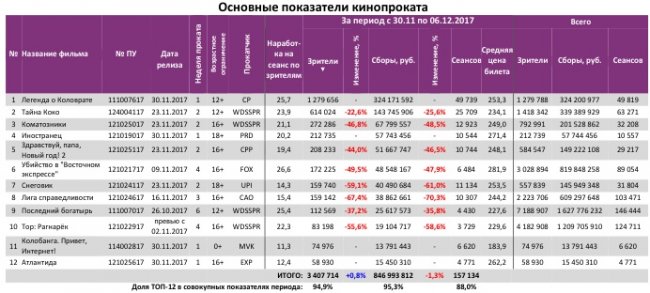 Отчет Фонда кино за 48 неделю 2017 года: Каждый третий билет пришелся на «Легенду о Коловрате»