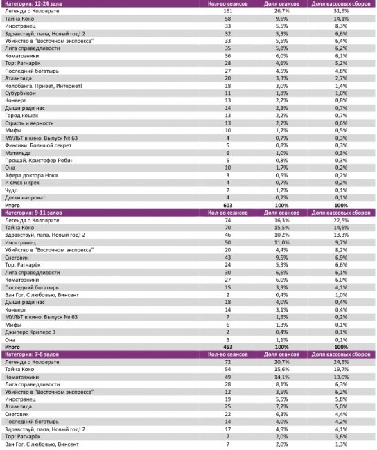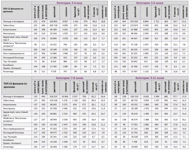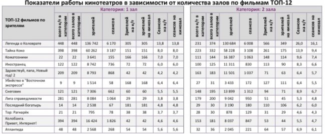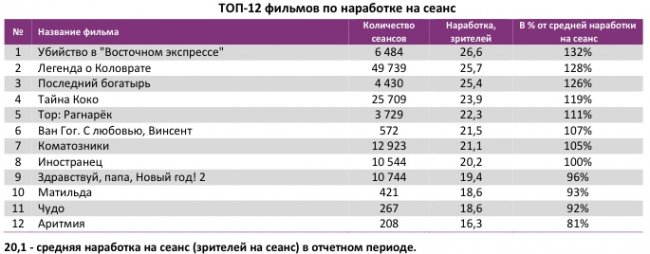 По показателю наработки на сеанс лидирует «Убийство в «Восточном экспрессе»». Также в топ-12 вошли четыре российских проекта и хит сегмента арт-мейнстрим «Ван Гог. С любовью, Винсент».