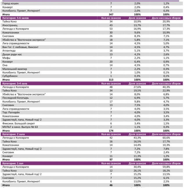 В семи лучших кинотеатрах страны «Легенда о Коловрате» продемонстрировала долю кассовых сборов 17-61%.
