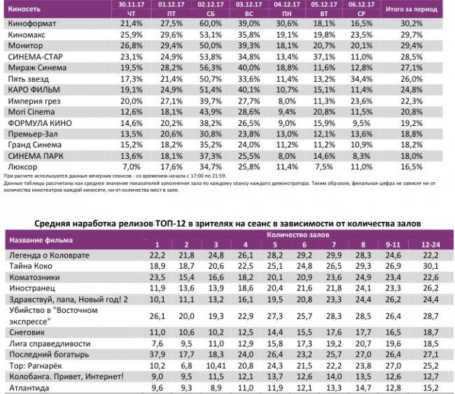 Как показывает индустриальная статистика с 30 ноября по 6 декабря 2017 года (неделя №48), на неделе на стыке ноября и декабря было продано столько же билетов, сколько и на предыдущей - 3,6 млн. Каждый третий билет пришелся на новинку - «Легенда о Коловрате». За первую неделю «Легенду о Коловрате» посмотрело 1,28 млн зрителей, что эквивалентно 324 млн рублей. Также в топ-12 попала российская анимация «Колобанга. Привет, Интернет!». «Убийство в «Восточном экспрессе»» преодолело рубеж в 800 млн рублей, «Лига справедливости» - в 600 млн, а «Тор: Рагнарек» - в 1,2 млрд рублей.