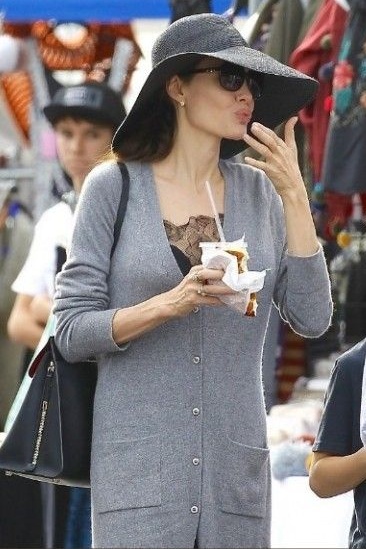Для семейной прогулки худощавая актриса выбрала серый кардиган и черное платье. Шляпа и очки не помогли Джоли остаться незамеченной.