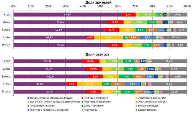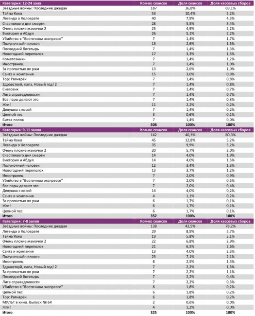 В семи лучших кинотеатрах страны «Звёздные войны» показали долю кассовых сборов от 69% до 96%.