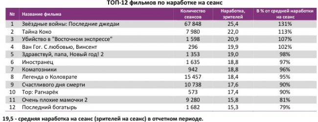По показателю наработки на сеанс детектив «Убийство в «Восточном экспрессе»» продолжает держаться в топ-3. Первое место у новинки «Звёздные войны: Последние джедаи».