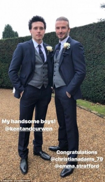 43-летняя дизайнер и экс-солистка группы Spice Girls Виктория Бекхэм поделилась снимком своего сына Бруклина и мужа Дэвида Бекхэм в Instagram. На фото Бруклин и Дэвид позируют в костюмах с прикрепленными к ним розами. Известно, что семья Бекхэм посетила свадьбу брата Виктории. "Мои красавчики", – подписала фото знаменитость.