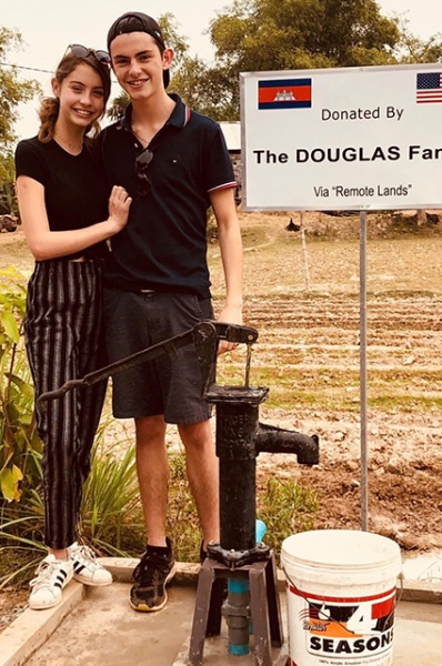 На одной из фотографий дети актеров позируют рядом с колодцем, установленным на деньги их семьи.