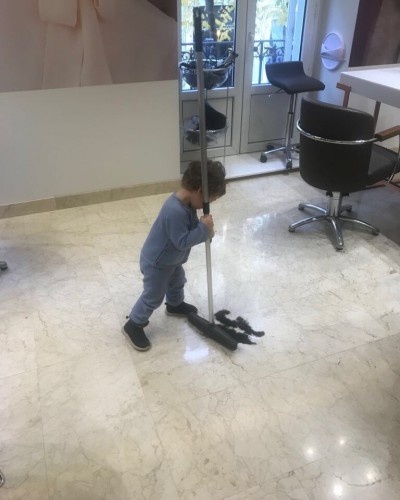 На фото, которое звездная мама опубликовала на личной страничке в соцсети, ее 3-летний сын Александр подметает пол в салоне красоты.