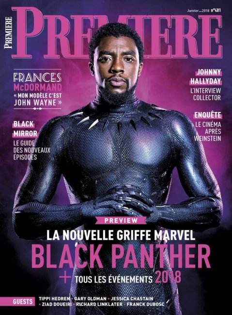Обложка французского журнала Premiere за январь с Чедвиком Боузманом в образе Чёрной Пантеры из одноимённого блокбастера Marvel. На широких экранах кинокомикс окажется 26 февраля.