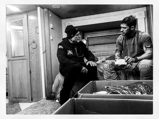 Том Харди и продюсер Ави Арад на съёмочной площадке кинокомикса «Веном» от студии Sony. В качестве режиссёра ленты выступает Рубен Фляйшер («Добро пожаловать в Zомбилэнд», «Охотники на гангстеров»).