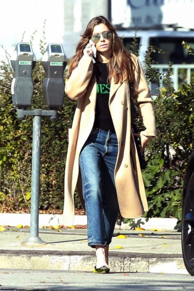 На днях красавицу Джессику Бил поймали на улицах Лос-Анджелеса в стильном образе: Джессика выбрала для прогулки джинсы-бойфренды и лодочки изумрудного оттенка, дополнив наряд свитером от Alberta Ferretti, черной сумкой и теплым пальто бежевого цвета.