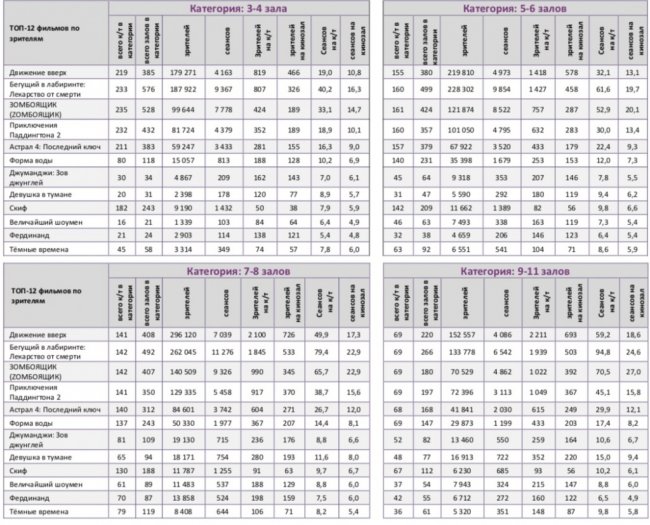 Как показывает индустриальная статистика с 25 по 31 января 2018 года (неделя №4), после окончания праздников посещаемость кинотеатров держится на уровне 4-4,4 млн проданных билетов в неделю. Лидерство по посещаемости сохраняет «Движение вверх» - в его активе каждый четвертый проданный билет. Картину посмотрело в российских кинотеатрах уже свыше 10,7 млн. зрителей (2,66 млрд. рублей). Другая российская новинка комедия «Zомбоящик» стартовала со 134 млн. рублей за первые семь дней проката. У «Скифа» после двух недель 54 млн.