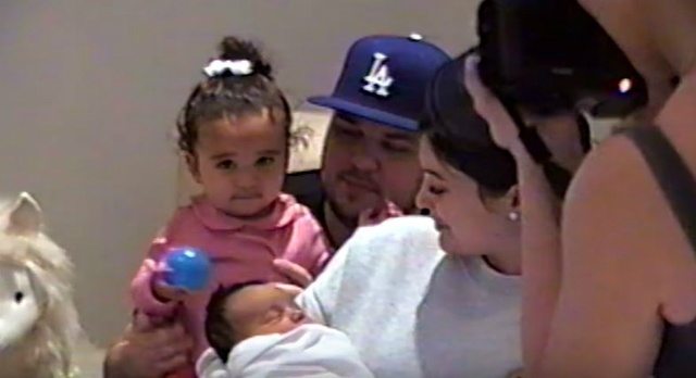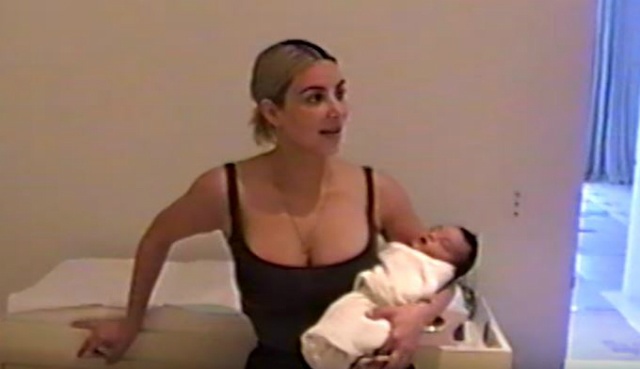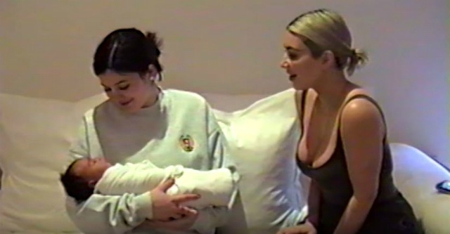 В середине ролика в кадре появляется Ким Кардашьян, протягивающая своего третьего ребенка Кайли.