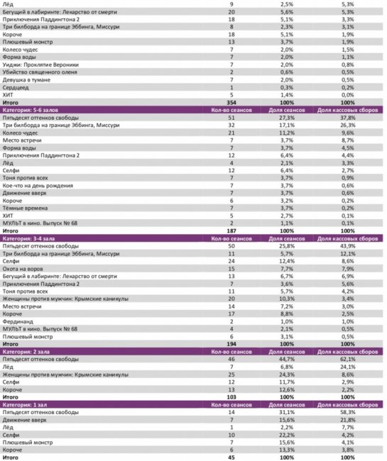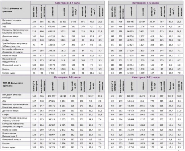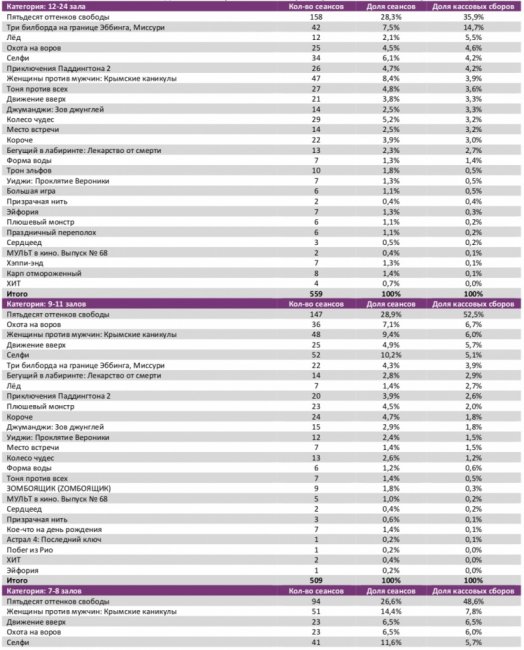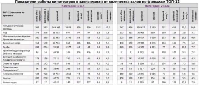 В однозальных кинотеатрах одинаково широко были представлены «Пятьдесят оттенков свободы», «Лёд» и ««Женщины против мужчин 2».
