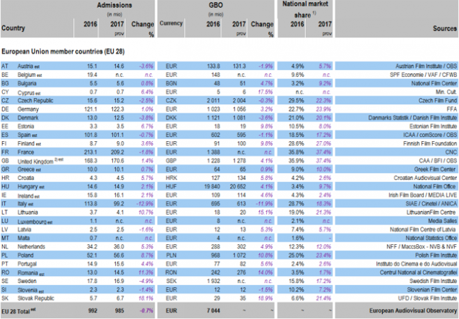 В сравнении с 2016 годом доля кассовых сборов национальных фильмов в Европе увеличилась в 11 и снизилась в 13 из 24 стран. Самые высокие показатели доли национального кино (включая фильмы с инвестициями американских киностудий) во Франции и Великобритании, до 37,4% в обоих случаях. А также в Финляндии (27,0%), Германии (23,9%), Польше (23,4%), Чешской республике (22,3%), Словацкая республике (21,4%) и Литве (21,3%). За пределами ЕС в 2017 году больше всех собирали национальные фильмы в Турции, их доля составила 56,5%.