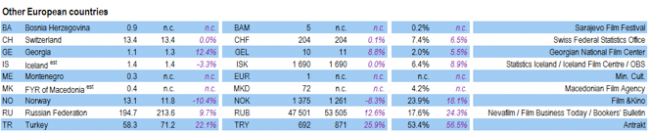 За пределами ЕС российский рынок впервые превысил отметку в 200 млн., увеличив оборот на 9,7% до 213,6 млн. Это самый высокий уровень, достигнутый в новейшей истории, подтверждающий укрепление позиций России в качестве первого европейского рынка. После двухлетней стагнации Турция, седьмой по величине европейский рынок кино, зарегистрировала столь же впечатляющий рост посещаемости кинотеатров, при этом показатели увеличились на 22,1% с 58,3 млн. до 71,2 млн. проданных билетов. С другой стороны, Норвегия зарегистрировала снижение на 10,4% по сравнению с показателем 2016 году.