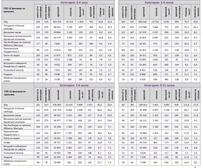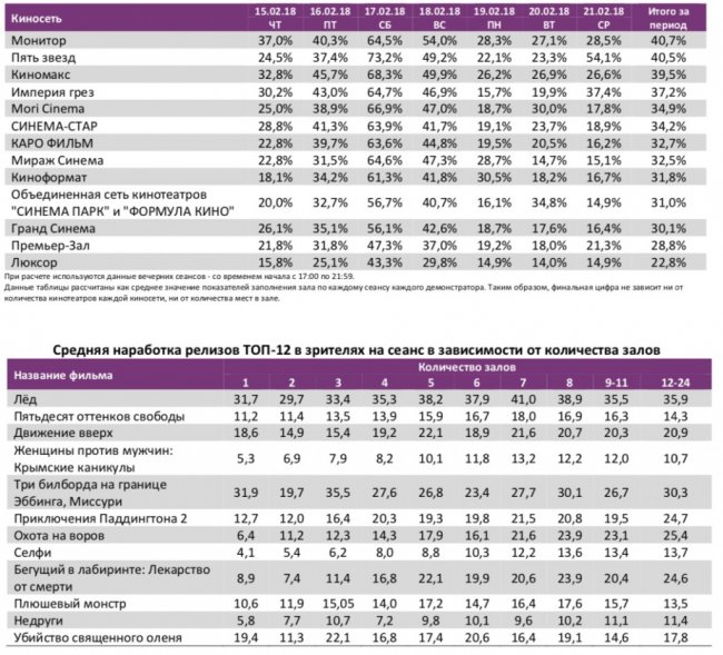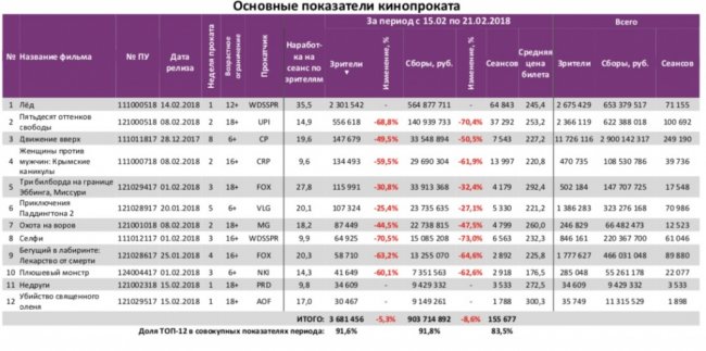 Как показывает индустриальная статистика с 15 по 21 февраля 2018 года (неделя №7), посещаемость российских кинотеатров осталась на уровне прошлой недели – 4 млн. против 4,2 млн. зрителей. Свыше половины проданных билетов пришлось на долю российского фильма «Лёд». За первые восемь дней проката российский спортивный мюзикл посмотрело 2,7 млн. зрителей, а кассовые сборы превысили 650 млн. рублей. Снова менее 50% посещаемости потеряло «Движение вверх», преодолевшее рубеж в 3 млрд. рублей.