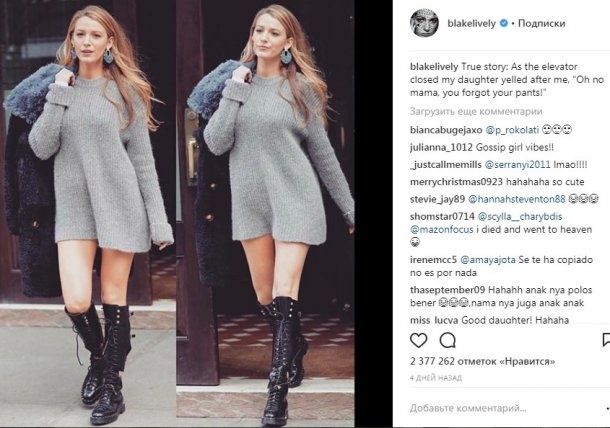 Об этом рассказала сама Блейк в Instagram под фотографией, на которой она запечатлена в сером платье-свитере от Haider Ackermann и сапогах от Valentino.
