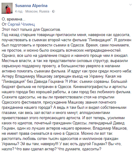 Минус еще один на Atlas Weekend: Найка Борзова не пустили в Украину"Местные власти, а также представители силовых структур, выразили серьезную поддержку проекту, а большинство уверяло в желании активно помогать съемкам фильма. И вдруг как гром среди ясного неба: актеру Владимиру Машкову запрещен въезд в Украину. Какая же "Ликвидация" без Давида Гоцмана?! Итак: съемки сорваны. Большой бюджет фильма не потрачен в Одессе. Кинематографисты и артисты нашего города без хорошей работы, а сам город без любимого фильма", - заявил Члиянц.