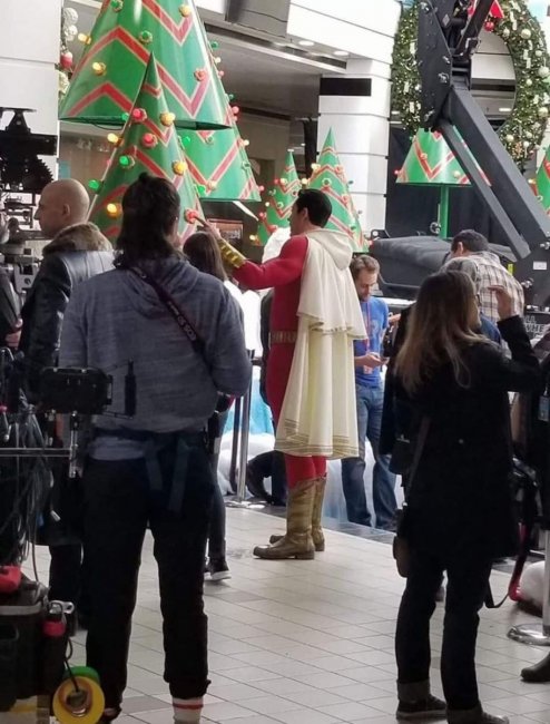 В Сеть просочились новые фото со съёмок блокбастера DC «Шазам!» с участием Закари Левая в образе титульного супергероя и Марка Стронга, исполняющего роль главного злодея доктора Таддеуса Сиваны.