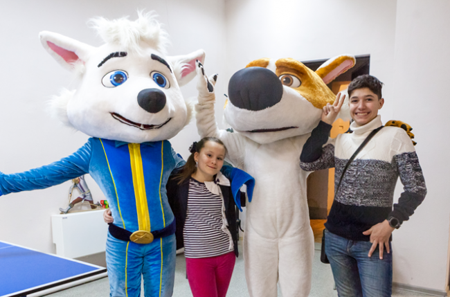 Гостей встретили в холле герои «Белки и Стрелки» — аниматоры в костюмах ростовых кукол. Они рассказали про персонажей знаменитого мультфильма и расспросили детей, что привело их на студию.
