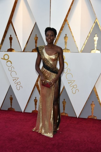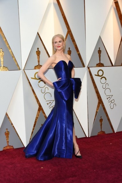Люпита Нионго выбрала металлизированное платье с разрезом от Atelier Versace. Эмили Блант появилась в нежно-голубом платье от Schiaparelli, а Николь Кидман – в синем наряде с бантом от Armani Priv?.