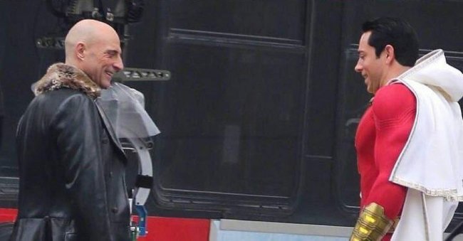 В Сеть просочились новые фотографии со съёмок супергеройского блокбастера «Шазам!» из вселенной DC, на которых можно получше рассмотреть костюм титульного персонажа, а также главного антагониста доктора Сивану в исполнении Марка Стронга.