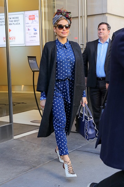44-летняя Ева Мендес нечасто балует своих поклонников появлениями на публике, однако, когда это происходит, от Евы невозможно отвести взгляда. Вот и сегодня актриса и дизайнер приковала к себе внимание папарацци очередным элегантным образом. Фотографы подловили Еву, когда она покидала презентацию новой коллекции одежды, которую она создала при сотрудничестве с New York & Company. Мендес выбрала лучший способ прорекламировать новую линейку: она продефилировала в сине-белом ансамбле из новой коллекции.