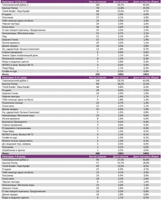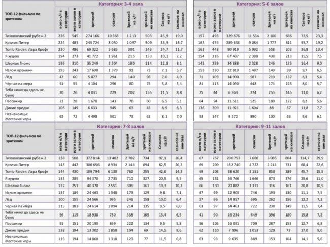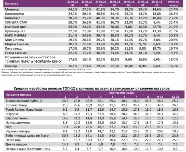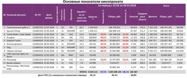 Как показывает индустриальная статистика с 22 по 28 марта (неделя №12), посещаемость в 4,5 млн зрителей обеспечили во многом две крупные новинки – «Тихоокеанский рубеж 2» (35%) и «Кролик Питер» (30%). Российский фильм «Я худею» на третьей неделе потерял менее половины сборов и увеличил общий бокс-офис до 585 млн рублей. «Лёд» преодолел рубеж в 6 млн проданных билетов и 1,45 млрд рублей. По наработке на сеанс высокие результаты у авторских фильмов «Три биллборда на границе Эббинга, Миссури» и «Тебя никогда здесь не было».